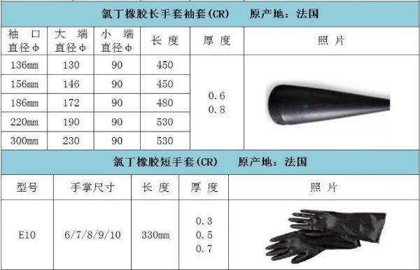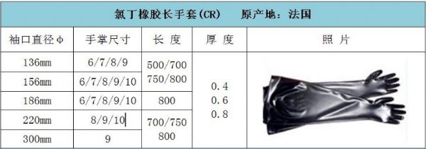 氯丁手套原產(chǎn)地法國,主要用于核電,防御,生物,半導體和制造業(yè)中的隔離器和手套箱的操作。常配套手套箱、操作箱、干燥箱、隔離器、灌裝生產(chǎn)線等使用??膳涮走M口手套箱,如:德國布勞恩手套箱、美國VAC手套箱、韓國高麗技研手套箱;各類國產(chǎn)手套箱等。