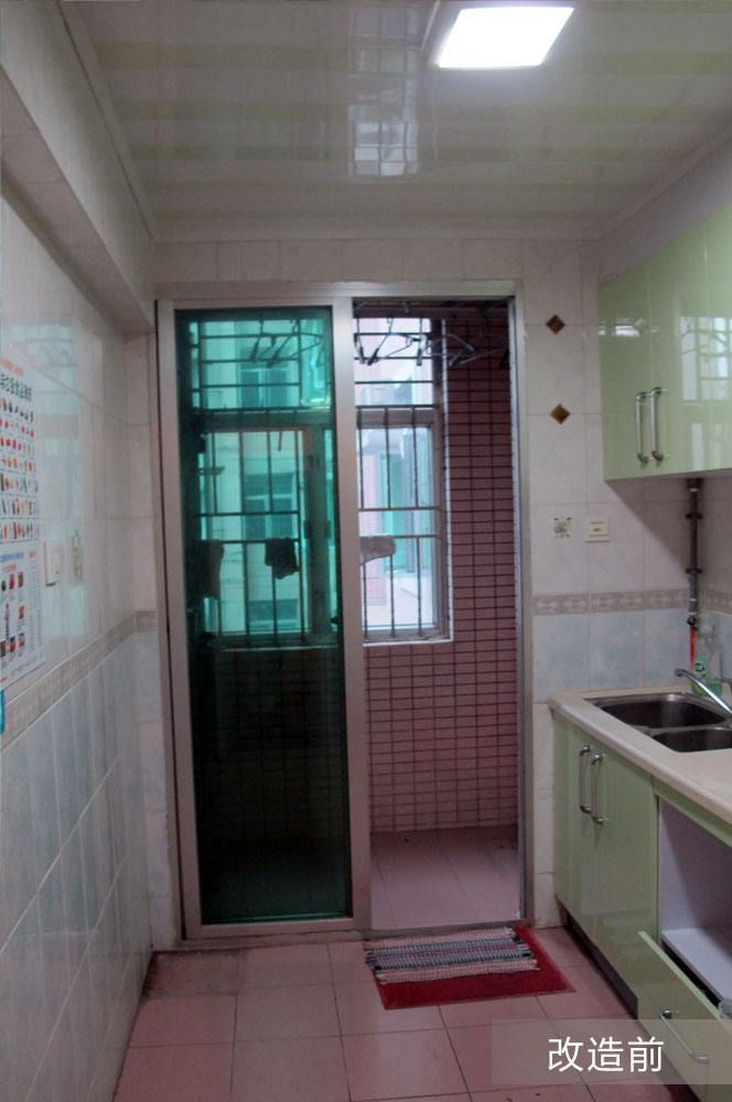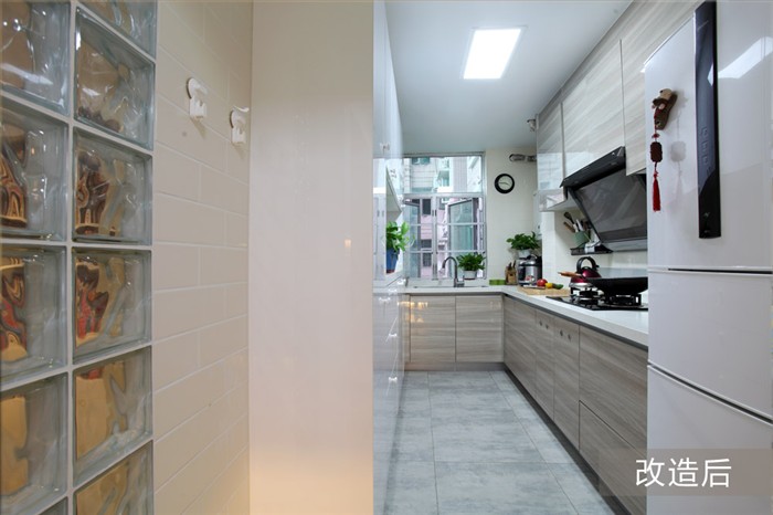 接下來(lái)走進(jìn)廚房了,原本的廚房還有個(gè)小陽(yáng)臺(tái),很狹長(zhǎng),現(xiàn)在的設(shè)計(jì)是把出陽(yáng)臺(tái)的那堵拆掉了,左邊的墻再往左推了一些,這樣左邊就有了一整面墻的高柜,高柜中間又多了一排的操作臺(tái)。現(xiàn)在的鍋碗瓢盆都可以往柜子塞,以前業(yè)主最擔(dān)心廚房因?yàn)樘|西沒(méi)地兒擺:)