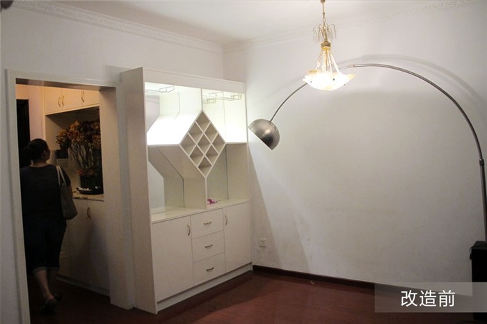 原本進(jìn)門(mén)位置有點(diǎn)擁擠,后面設(shè)計(jì)師把廚房的門(mén)改成了輕軌推拉門(mén),整個(gè)推拉門(mén)是一面大鏡子,靠廚房的那面鏡子噴上了白漆,入戶(hù)有了大大的全身鏡,出門(mén)前還來(lái)得及臭美一番,視覺(jué)上還擴(kuò)大了入戶(hù)的空間,鏡子里看到的是對(duì)面整面墻的柜子,中間層是放些隨手的東西,最底下是放隨時(shí)要進(jìn)出門(mén)的鞋子的,因?yàn)楸容^暗,還特別加了燈。