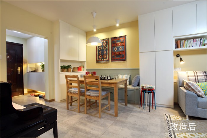 業(yè)主超喜歡的是這個(gè)餐廳卡座,可以擠很多人,還有旁邊的小圓凳,很實(shí)用,放下可以坐很多人,設(shè)計(jì)師特地挑了很多顏色,不管單獨(dú)拿出來(lái)還是疊起來(lái),都是一道美麗的風(fēng)景線,好看!呵呵!旁邊又有到頂?shù)墓褡,雜七雜八的東西都不怕沒(méi)地兒擱。
